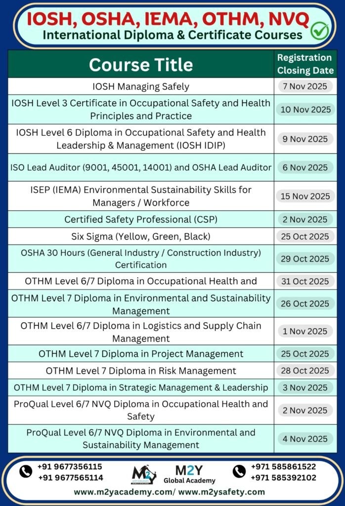 At M2Y Global Academy, we are dedicated to advancing occupational health and safety standards by providing high-quality safety education and training programs. Whether you’re a fresher aiming for a safety officer role or an experienced professional seeking career advancement, our academy offers the resources, training, and global certifications you need to succeed in today’s competitive safety industry.